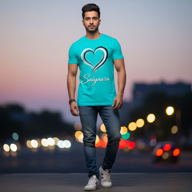 Inspired by the unforgettable Saiyaara movie theme, this Aqua Blue tee captures the purity of romance with a striking black & white heart-shaped design at its core. The soothing aqua tone adds freshness, while the heart speaks of timeless emotions.
