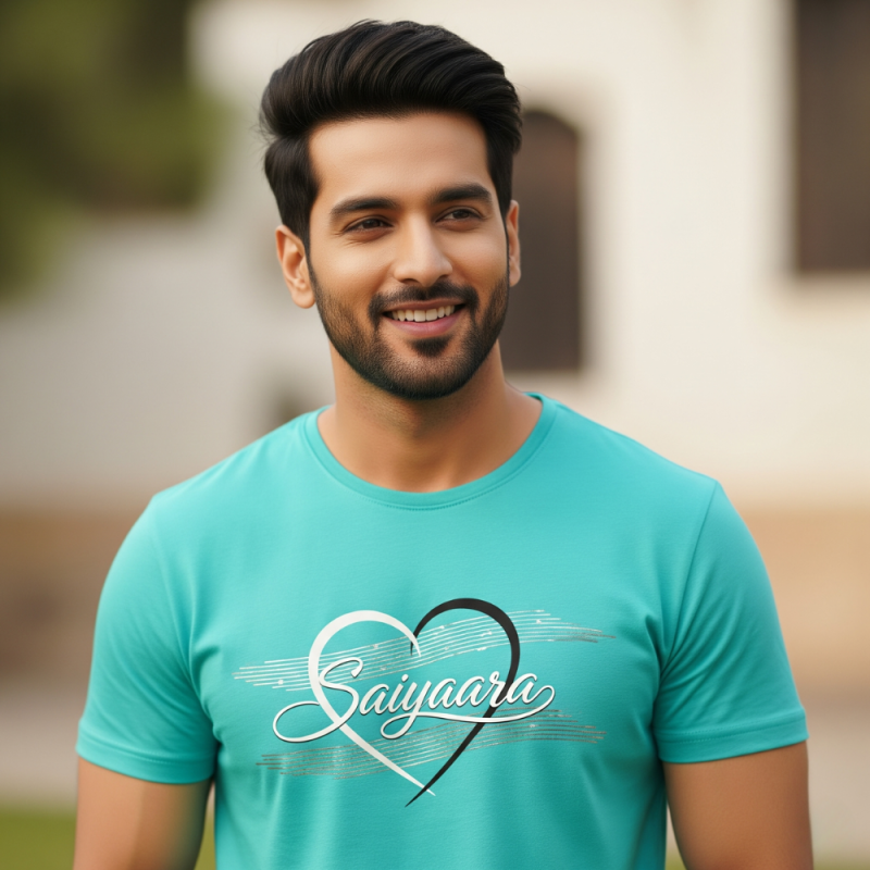 Aqua Blue Men’s T-Shirt with Saiyaara Movie Theme and Black & White Heart Shape, Half Sleeves, Round Neck, 250 GSM Cotton
