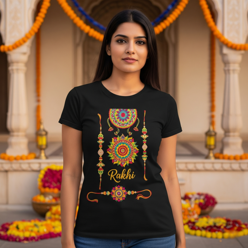 Festive Rakhi Tshirt for Women, Black Color, Half Sleeves, 100% Cotton, 250 GSM Fabric