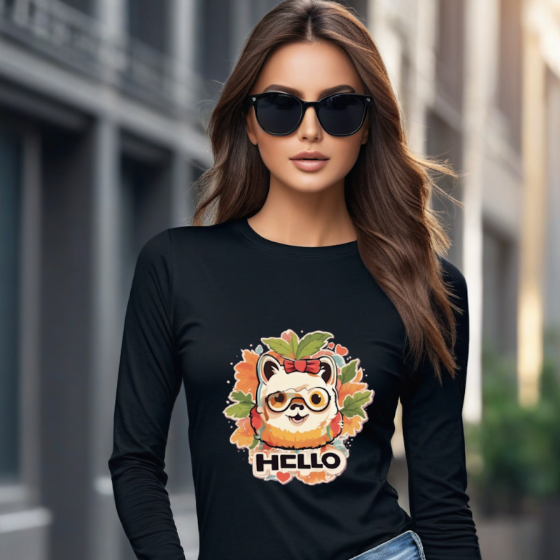 Printed T-Shirt for Women – Hello Design, Black, Long Sleeve