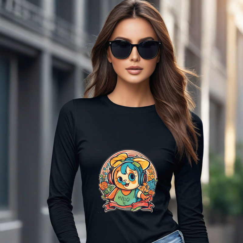 Printed T-Shirt for Women – Hello Design, Black, Long Sleeve