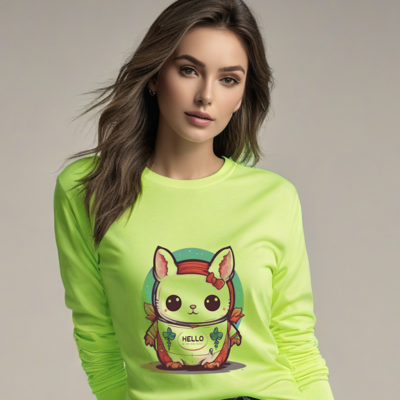 Neon Green Cotton Women’s Tee – Hello Graphic, Full Sleeves, 250 GSM