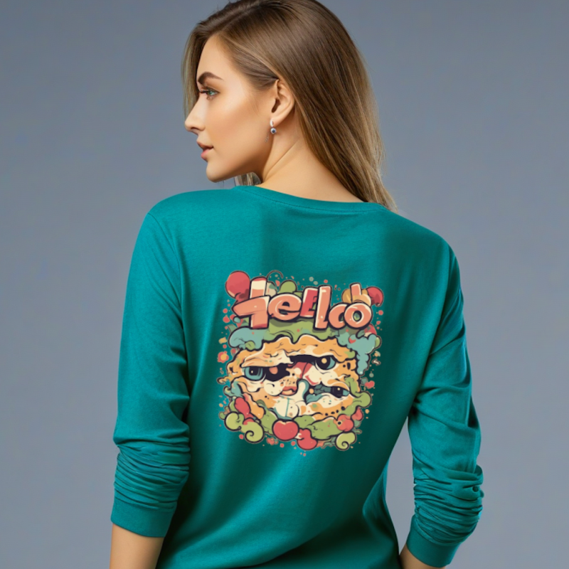 Effortless Style – Hello T-Shirt for Women, Green Blue Full Sleeves