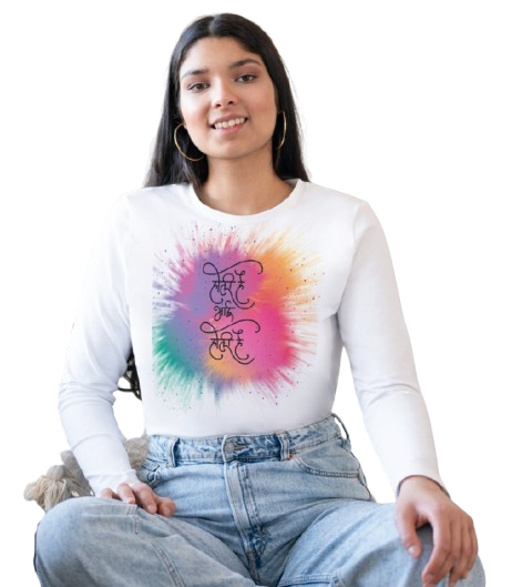 # Women’s Holi Pattern T-Shirt – White Cotton, Full Sleeves Step into the vibrant world of colors with our Women’s Holi Pattern T-Shirt! Crafted from premium white cotton, this full-sleeved piece is more than just a garment; it’s a celebration of tradition and style. Perfect for those who love to wear their culture with a modern twist, this t-shirt brings the joyous spirit of Holi right into your wardrobe. Our t-shirt is made from high-quality, breathable cotton, ensuring you stay comfortable throughout the day. The soft texture feels gentle on your skin, making it an ideal choice for any casual outing or festive gathering. The full sleeves add an extra layer of elegance, offering coverage while keeping you stylishly warm during cooler days. The Holi pattern on this t-shirt is a symphony of colors, representing the exuberance of the festival. Each splash of color is meticulously designed to capture the essence of Holi, making it a perfect attire for those looking to add a pop of color to their ensemble. Whether you’re attending a Holi party or simply enjoying a day out, this t-shirt ensures you stand out with its unique and vibrant design. Pair this t-shirt with your favorite jeans, skirts, or shorts to create a variety of looks. Its versatility makes it a staple in your wardrobe, allowing you to effortlessly transition from a festive event to a casual day out. The white backdrop enhances the vivid patterns, creating a visually appealing contrast that catches the eye. In line with our commitment to sustainability, this t-shirt is designed with eco-friendly practices, ensuring minimal environmental impact. By choosing this product, you’re not only embracing style but also supporting a greener planet. Don’t miss out on this limited edition piece that embodies the spirit of Holi. Add the Women’s Holi Pattern T-Shirt to your cart today and experience the perfect blend of tradition, comfort, and style. Let every day be a celebration with this vibrant addition to your fashion collection! > Embrace the colors, embrace the joy! Wear your tradition with pride. |