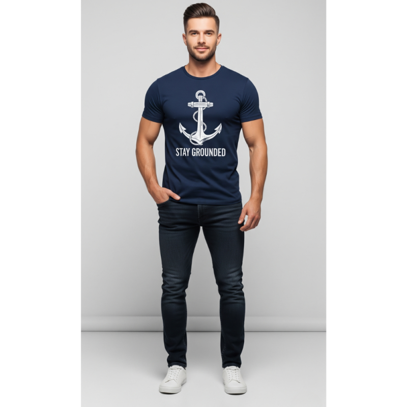 Sail through life with confidence in this Men’s Navy Blue T-Shirt featuring a striking anchor print and the steadying message “Stay Grounded.”