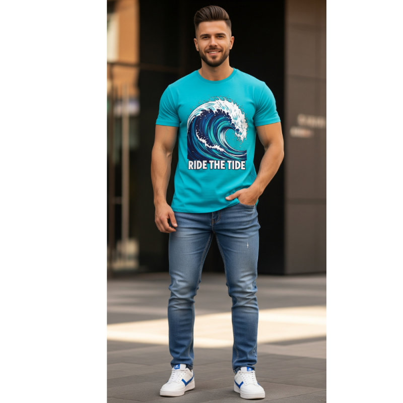 Men’s Aqua Blue “Ride the Tide” Tide Graphic Half Sleeves, Round Neck T-Shirt, 100% Cotton, 250 GSM