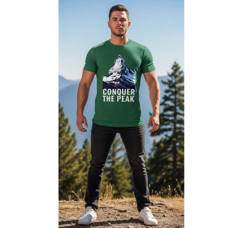 Men’s Bottle Green T-Shirt with Mount Everest Print, “Conquer the Peak” Tagline, Half Sleeves, Round Neck, 100% Cotton, 250 GSM