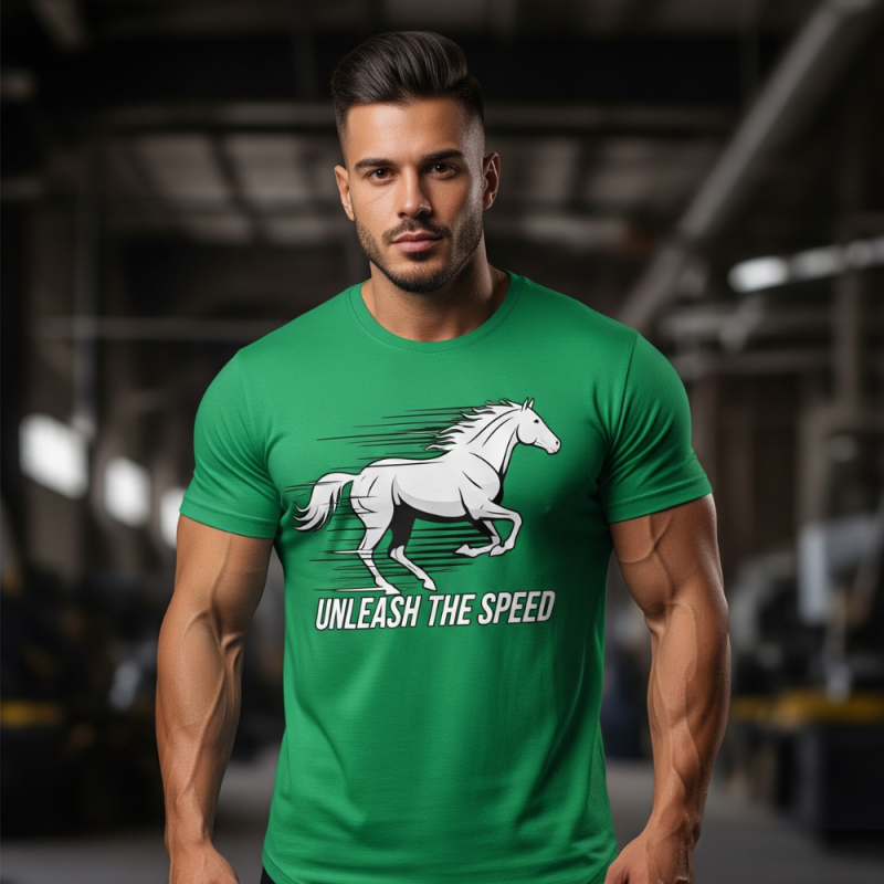 Charge ahead with unstoppable energy in this Men’s Bottle Green T-Shirt featuring a dynamic running horse graphic and the empowering tagline “Unleash the Speed.”