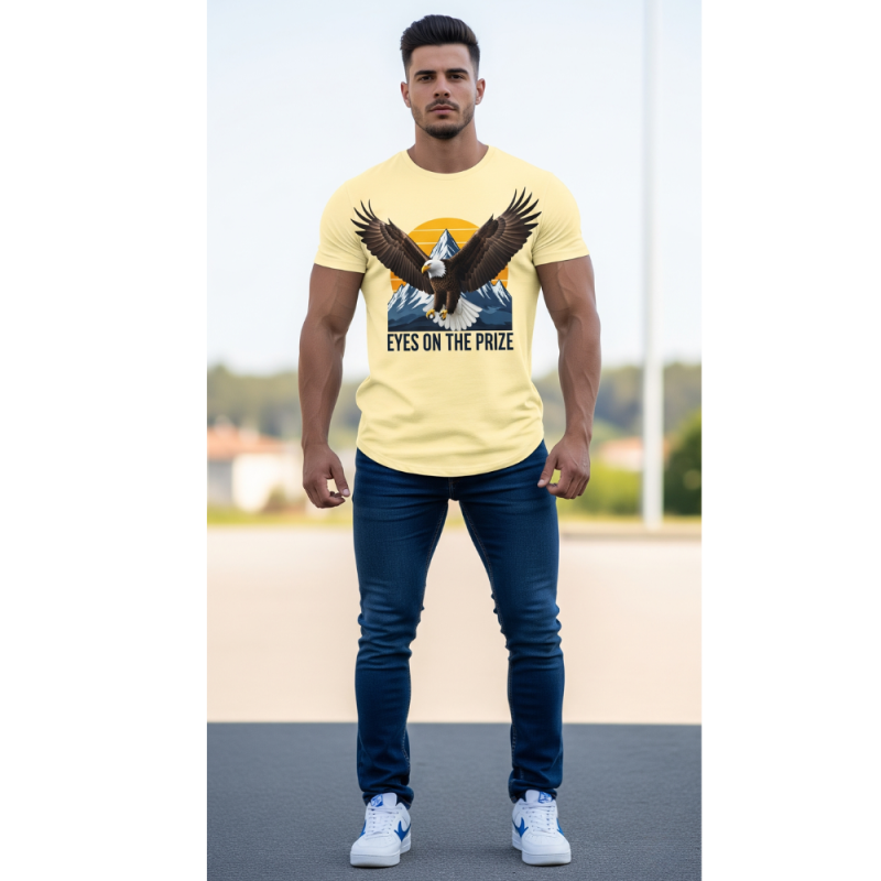 Channel razor-sharp focus with this Men’s Light Yellow T-Shirt showcasing a majestic eagle graphic and the inspiring tagline “Eyes on the Prize.”