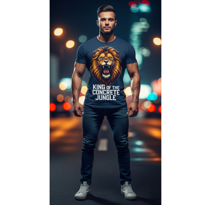 Command attention in this Men’s Navy Blue T-Shirt featuring a bold lion print and the powerful tagline “King of the Concrete Jungle.”