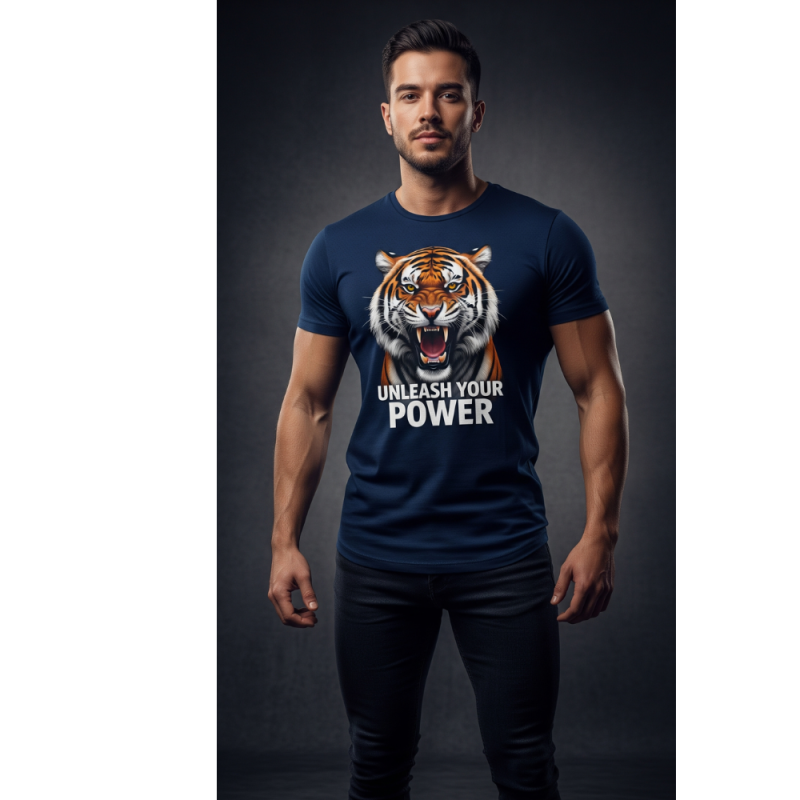 Tap into your wild side with this Men’s Navy Blue T-Shirt featuring a striking tiger print and the bold tagline “Unleash Your Power.”
