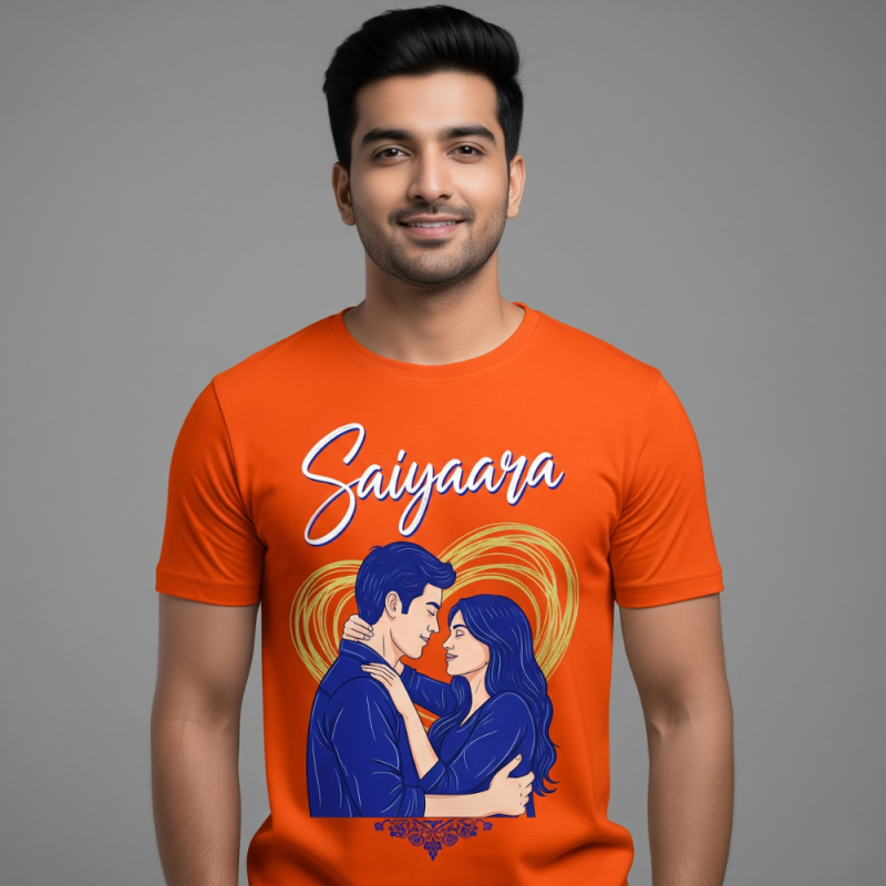 Celebrate love and style with this Saiyaara-inspired orange T-shirt for men, featuring a romantic couple print with a heart symbol that beautifully captures the essence of Bollywood romance. Crafted from 100% pure cotton and designed with 250 GSM fabric weight, this T-shirt ensures premium comfort with a durable finish.