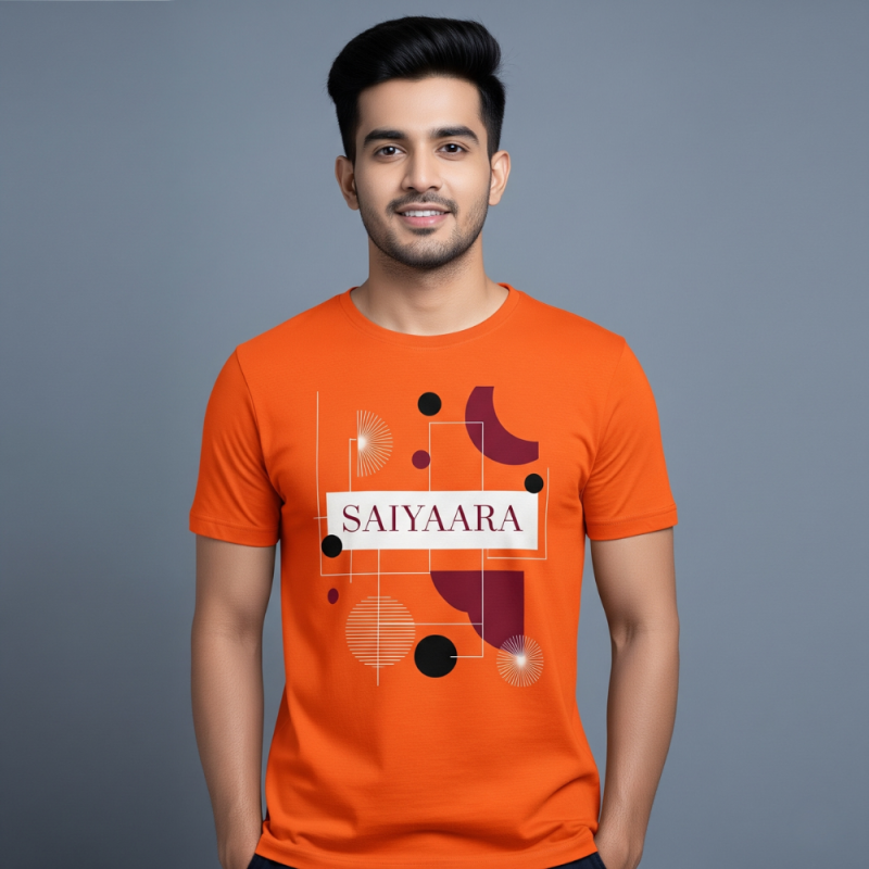 Add a touch of Bollywood charm to your wardrobe with this Saiyaara-themed orange T-shirt for men. Designed with a striking cinematic-inspired print, this tee perfectly blends fashion with film nostalgia.