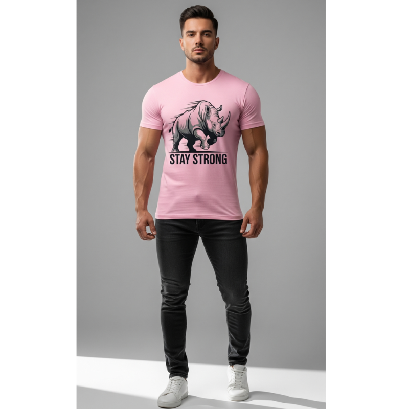 Stand out with this Men’s Pink Half Sleeves, Round Neck T-Shirt featuring a striking rhino graphic on the front.