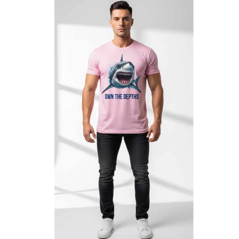 Men’s Pink Shark Graphic Half Sleeves, Round Neck T-Shirt, Ocean Predator Print, 100% Cotton, 250 GSM