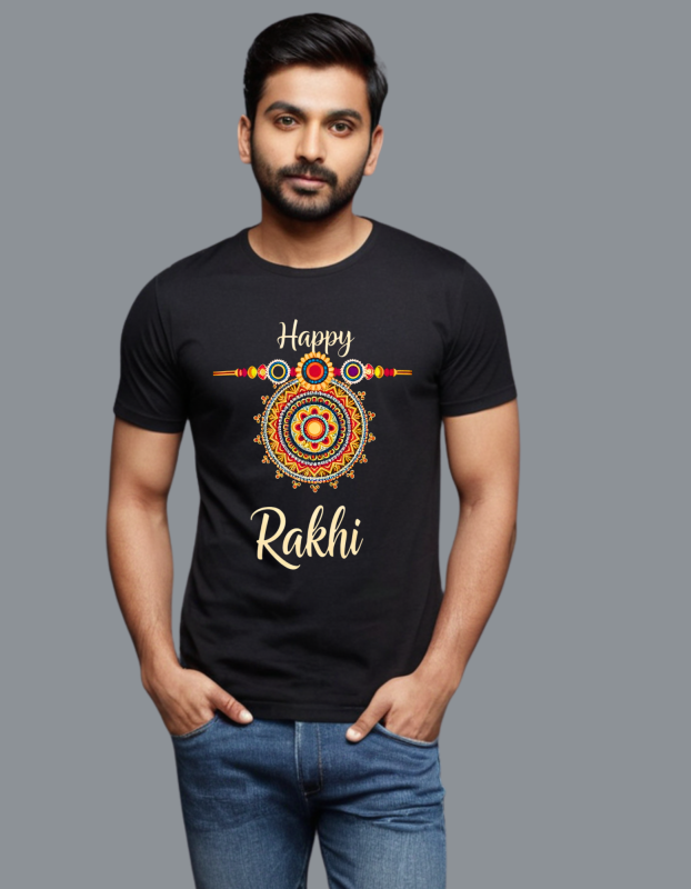 Men’s Black Cotton Rakhi T-Shirt, 250 GSM, Half Sleeves, Round Neck, Festive Print