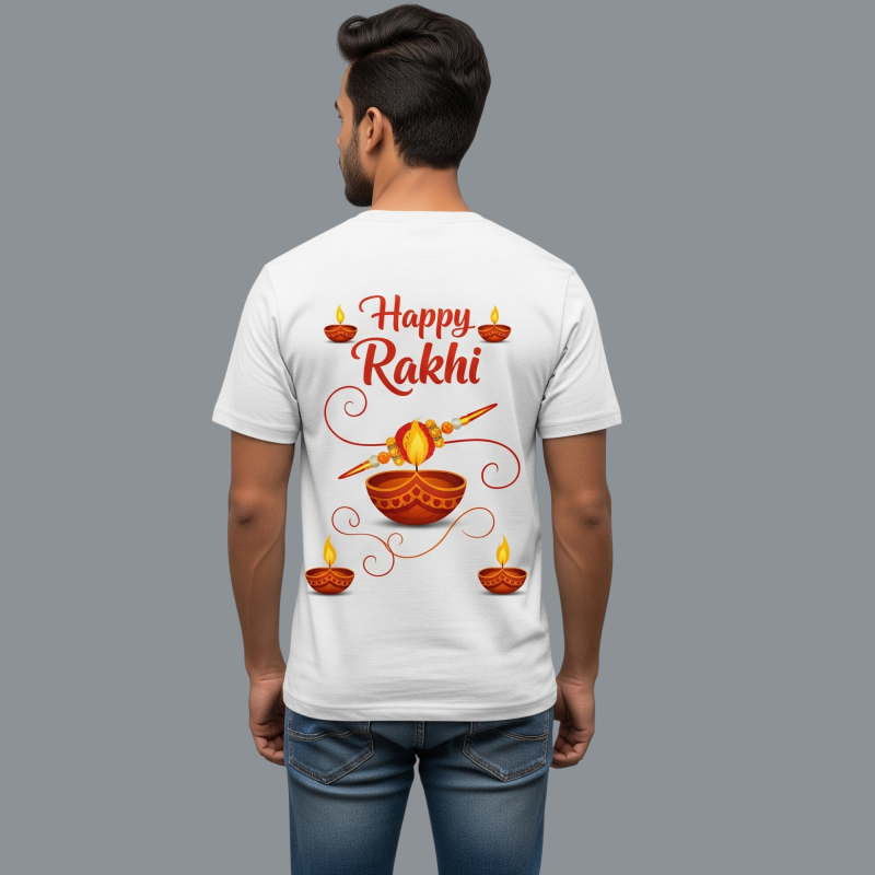 Men’s Rakhi Special T-Shirt, White Color, Back Print “Happy Rakhi” Theme, 100% Cotton, 250 GSM