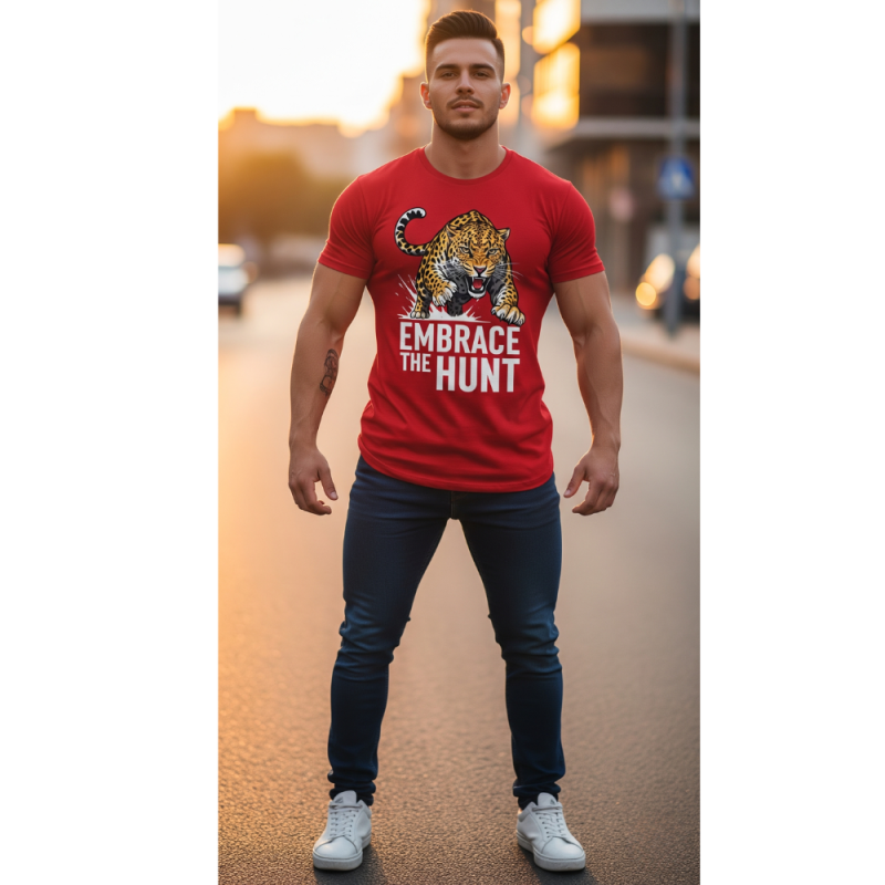 Step into the wild with this Men’s Red Half Sleeves, Round Neck T-Shirt featuring a striking cheetah print and the bold tagline “Embrace the Hunt.”