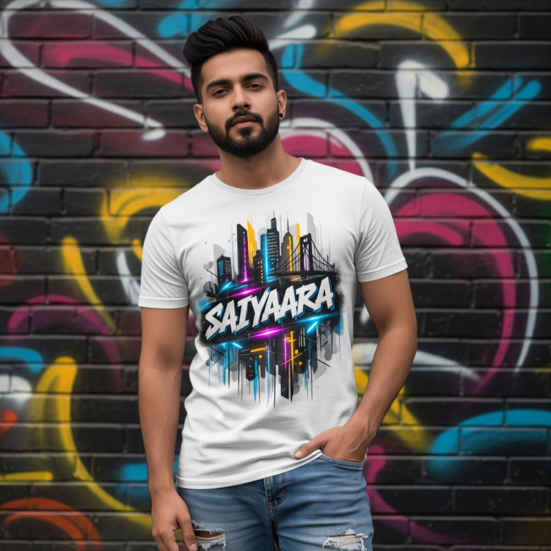 Bring the magic of cinema to your wardrobe with this Men’s White T-Shirt inspired by the Saiyaara movie theme. The front features a striking themed graphic print that captures the emotion and artistry of the film.