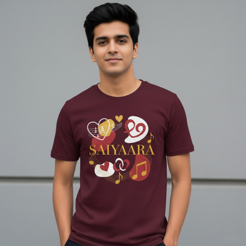 Wine Color Men’s T-Shirt with Saiyaara Movie Name and Musical Print | Half Sleeves, Round Neck, 100% Cotton, 250 GSM