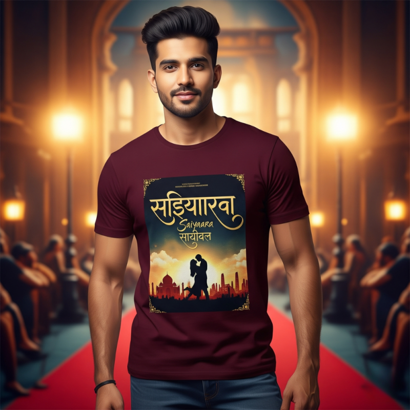 Men’s Wine Color T-Shirt with Saiyaara Movie Theme Poster, 100% Cotton, 250 GSM, Round Neck, Half Sleeves