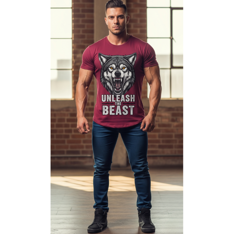 Step into your wild side with this Men’s Wine T-Shirt featuring a striking wolf image and the fearless tagline “Unleash the Beast” printed boldly in the centre.