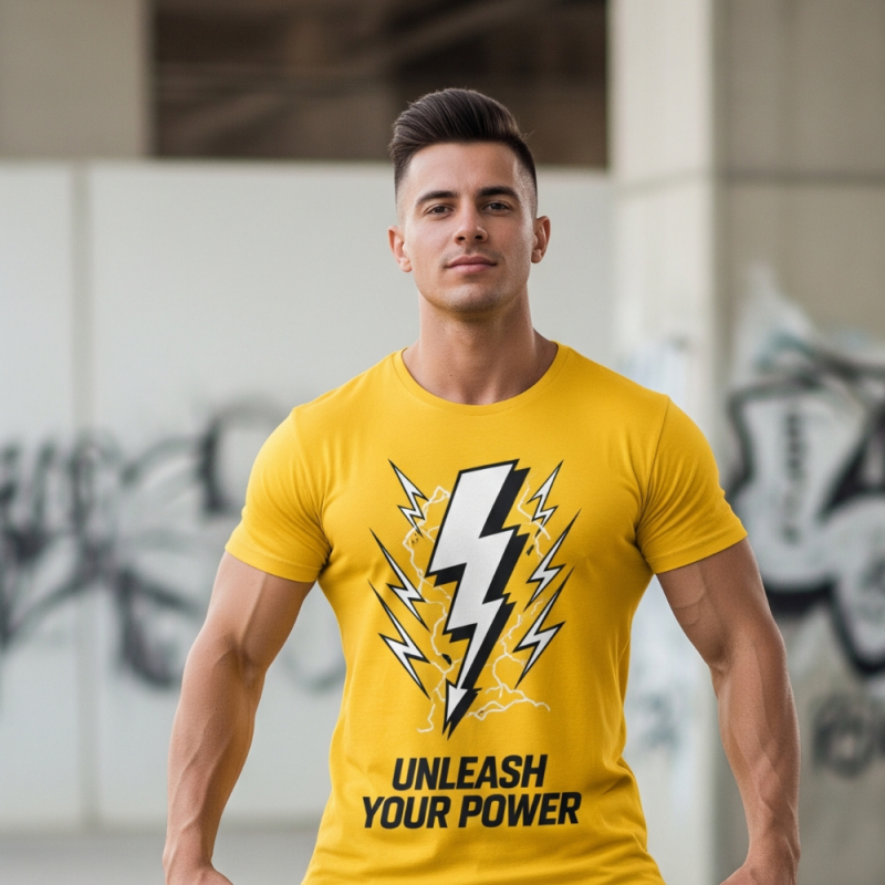 Men’s Yellow Lightning Bolt Graphic Half Sleeves, Round Neck T-Shirt, Power & Energy Design, 100% Cotton