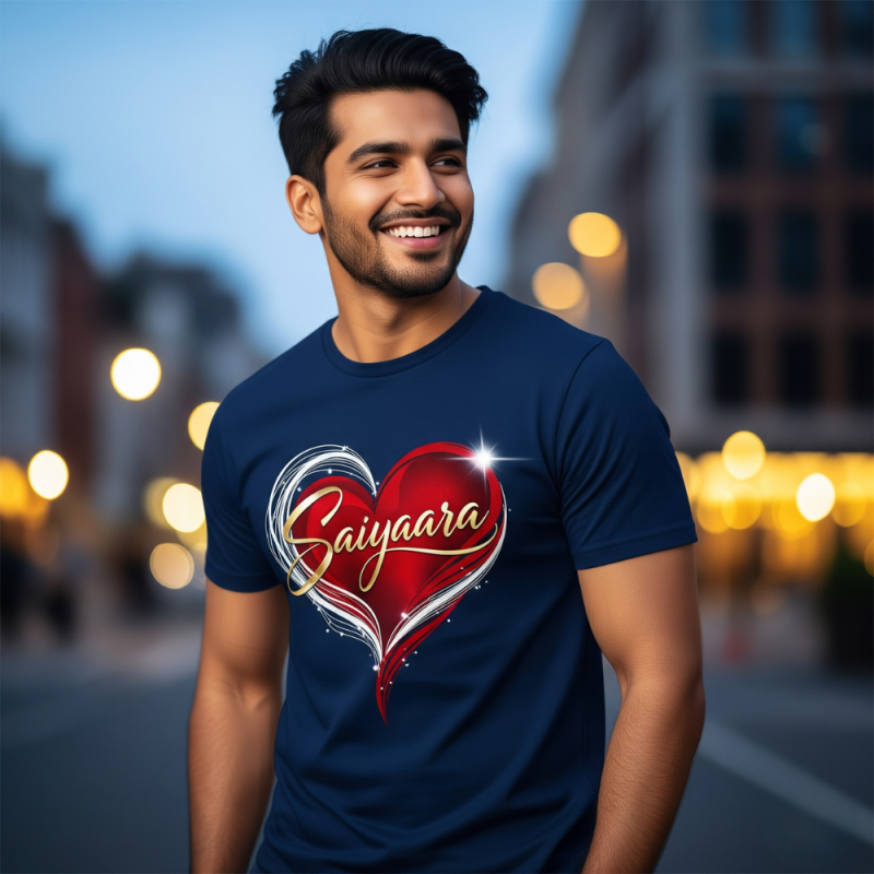 A tshirt that wears your heart out loud! This Saiyaara movie-inspired navy blue T-shirt with a beautiful heart design blends romance, style, and comfort. Crafted from 250 GSM premium cotton, it’s the perfect pick for fans who want to carry a piece of Bollywood love everywhere.