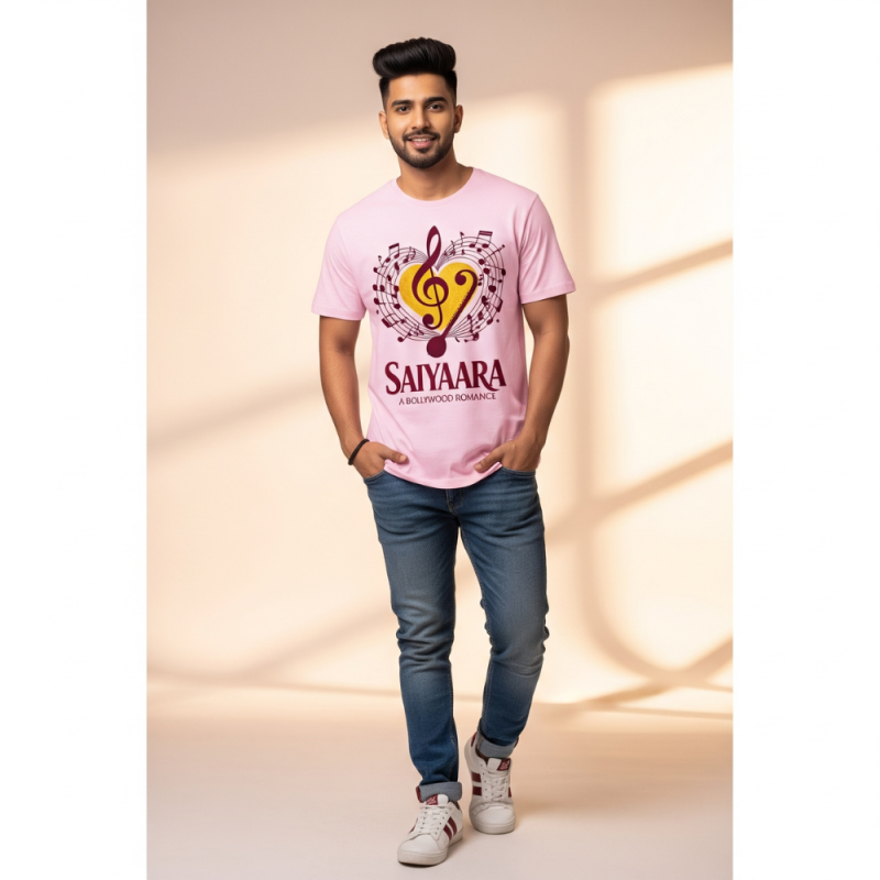 Color & Design: Elegant pink T-shirt featuring the Saiyaara movie name with a musical heart-shaped print, symbolizing love and melody.