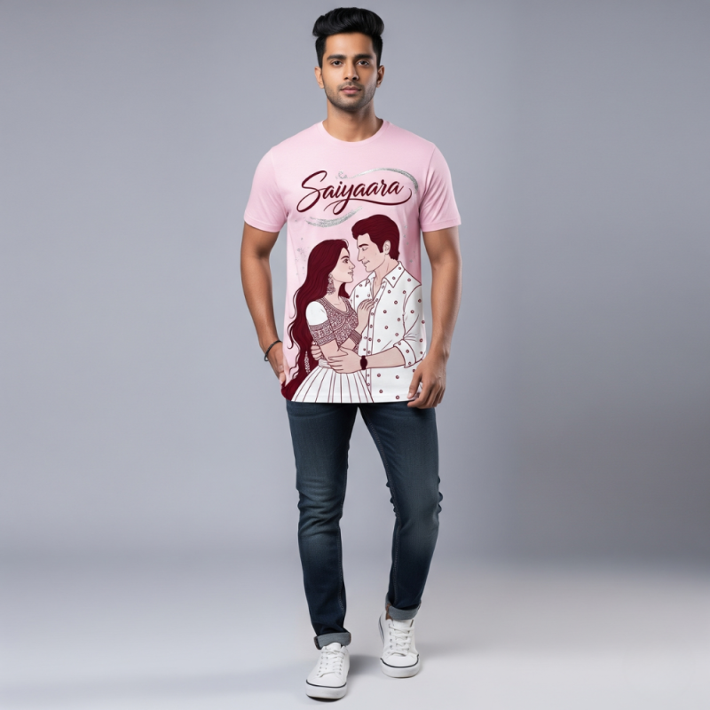 Pink Men’s T-Shirt with Saiyaara Movie Theme | Full Couple Graphic Print | Round Neck, Half Sleeves, 100% Cotton, 250 GSM