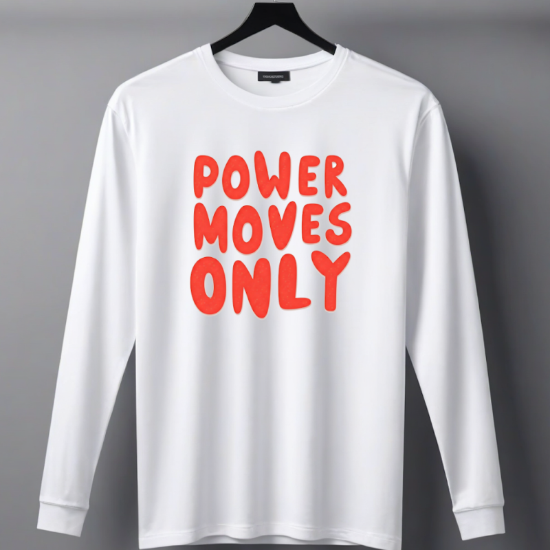 Confident & Comfortable – White Full Sleeve Tee with Power Moves Only Quote