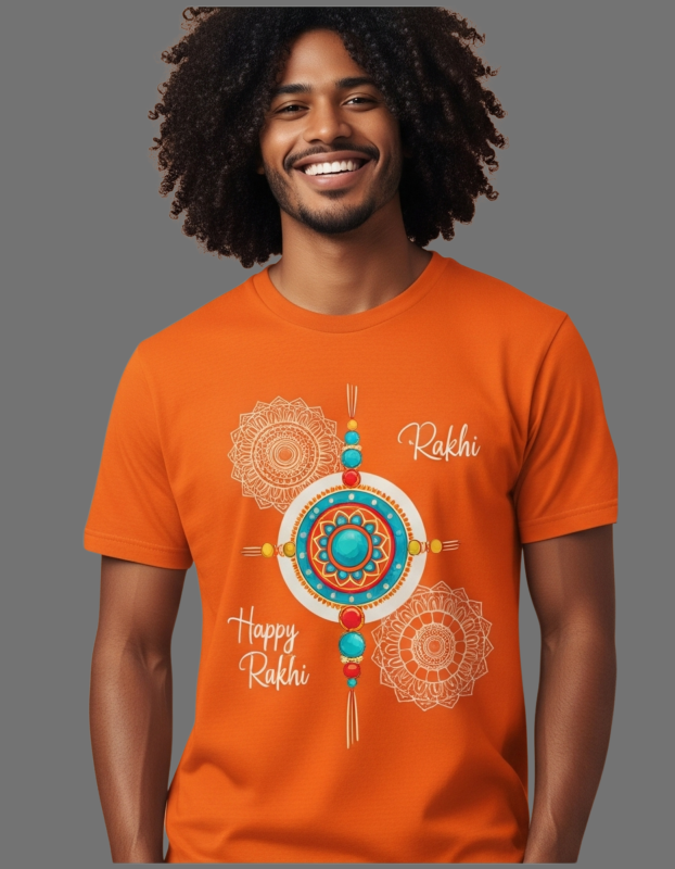 Men’s Raksha Bandhan T-Shirt, Orange Color, Center Rakhi Design Print, 100% Cotton, 250 GSM