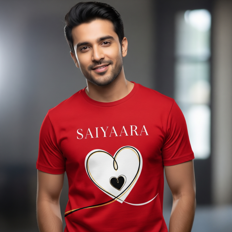 Fall in love with every wear – this Saiyaara-inspired T-shirt brings Bollywood romance straight into your wardrobe. The bold red color symbolizes passion, while the heart-shaped print with the movie’s name captures the true essence of love and togetherness. Made with 100% premium cotton at 250 GSM, this half-sleeve, round-neck tee blends comfort with a cinematic flair. Whether you’re a die-hard Bollywood fan or simply want to wear your heart out loud, this T-shirt is made just for you.