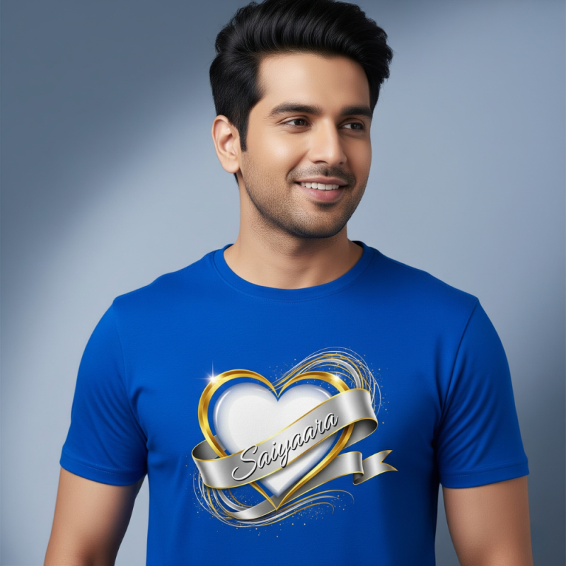 Royal Blue Men’s T-Shirt with Beautiful Heart Pattern and Saiyaara Print, Half Sleeves, Round Neck, 250 GSM Cotton