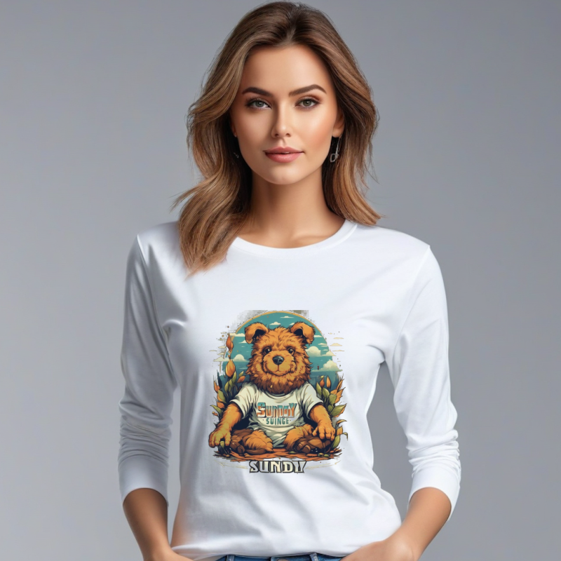 Sunday cool bear white cotton t-shirt for women, Full Sleeves