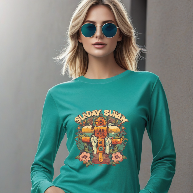 Full Sleeve Cotton Tee – Greenish Blue Sunday Pattern, 250 GSM