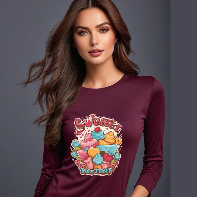 Wine Color Cotton Full Sleeve T-Shirt for Women – Sweet Print Design