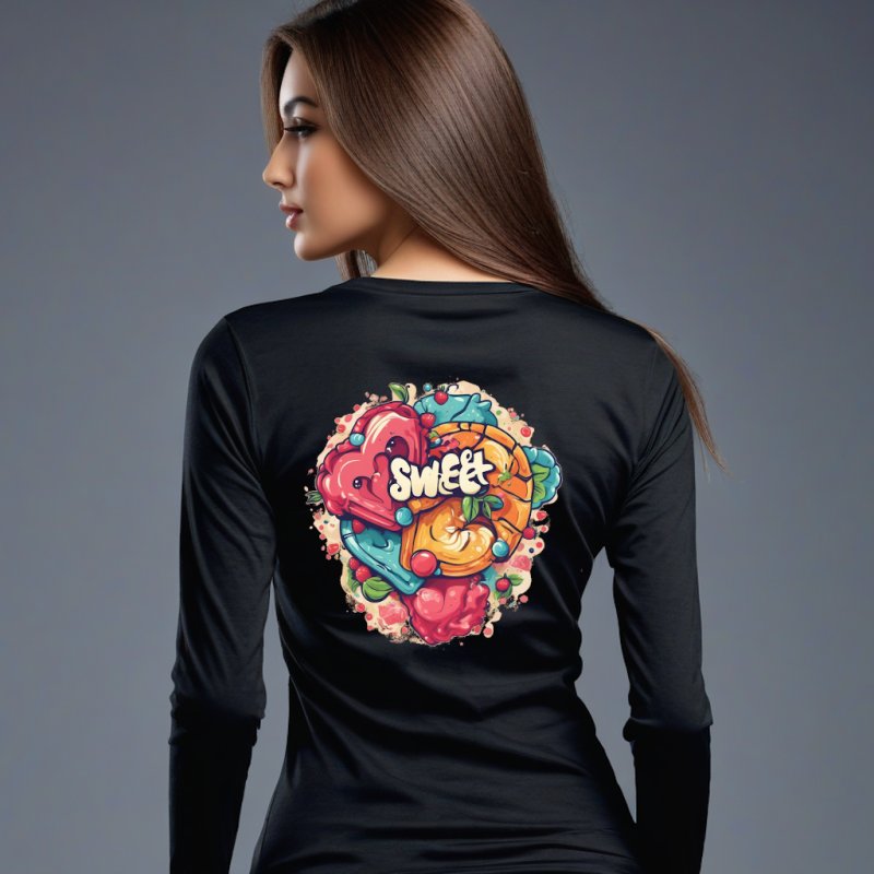 Sweet Text Women’s Tee – Black Cotton, Long Sleeves