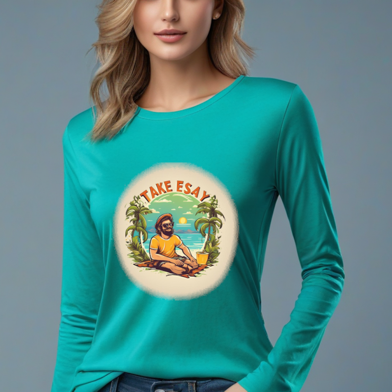 Women’s Full Sleeve Tee – Chill Mode On with Take It Easy Print Greenish Blue