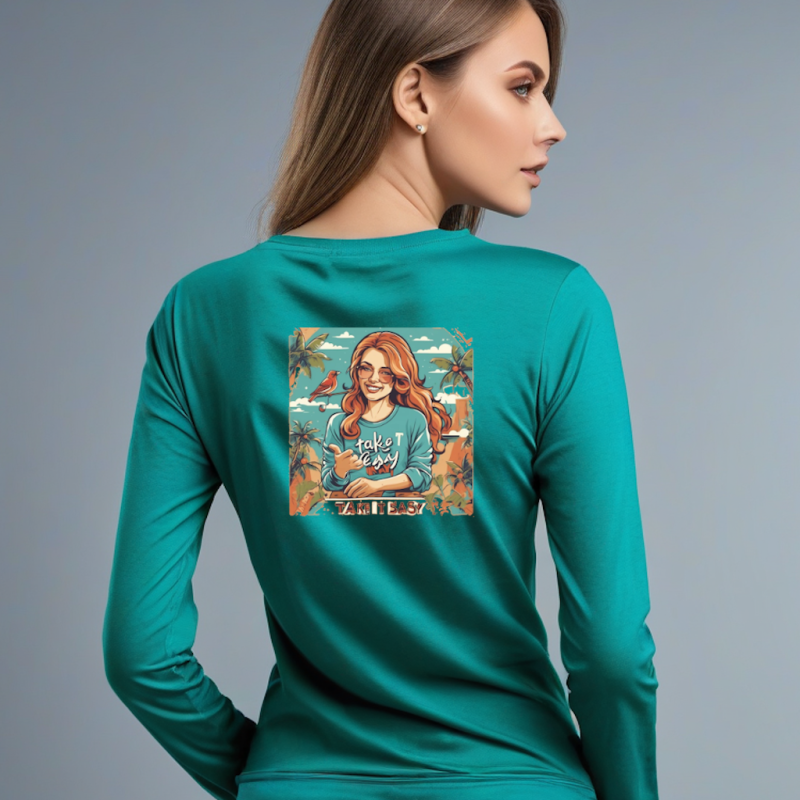 Women’s Full Sleeve Tee – Chill Mode On with Take It Easy Print Greenish Blue