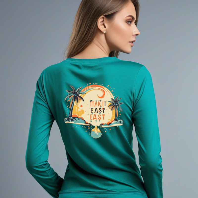 Women’s Full Sleeve Tee – Chill Mode On with Take It Easy Print Greenish Blue
