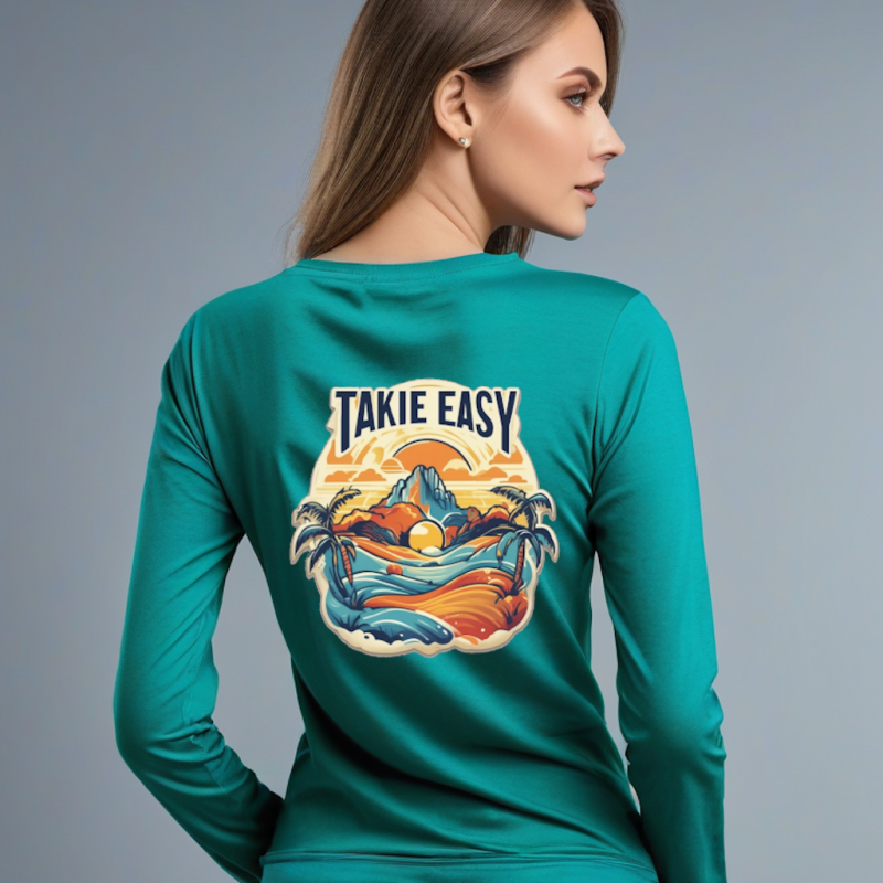 Women’s Full Sleeve Tee – Chill Mode On with Take It Easy Print Greenish Blue