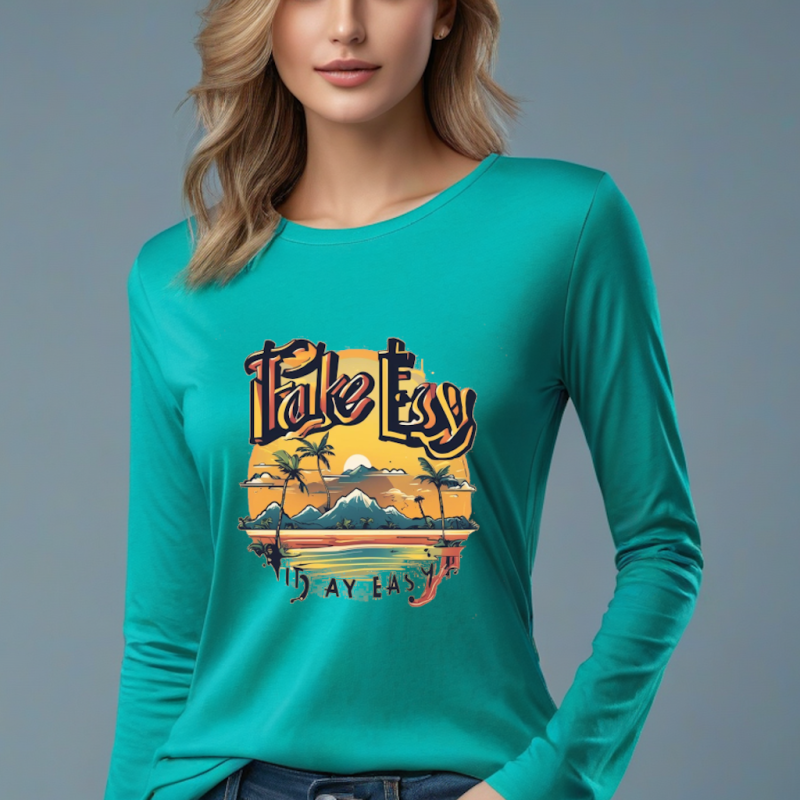 Women’s Full Sleeve Tee – Chill Mode On with Take It Easy Print Greenish Blue