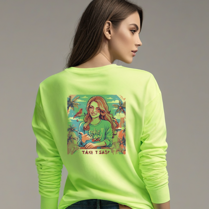 Take It Easy Graphic T-Shirt – Neon Green Cotton Long Sleeve for Her