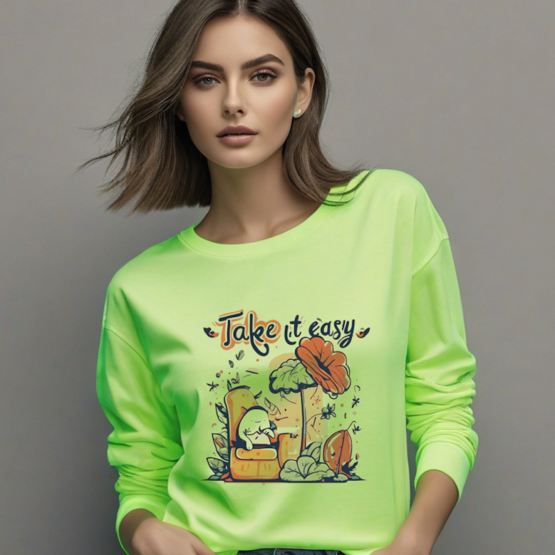 Take It Easy Graphic T-Shirt – Neon Green Cotton Long Sleeve for Her