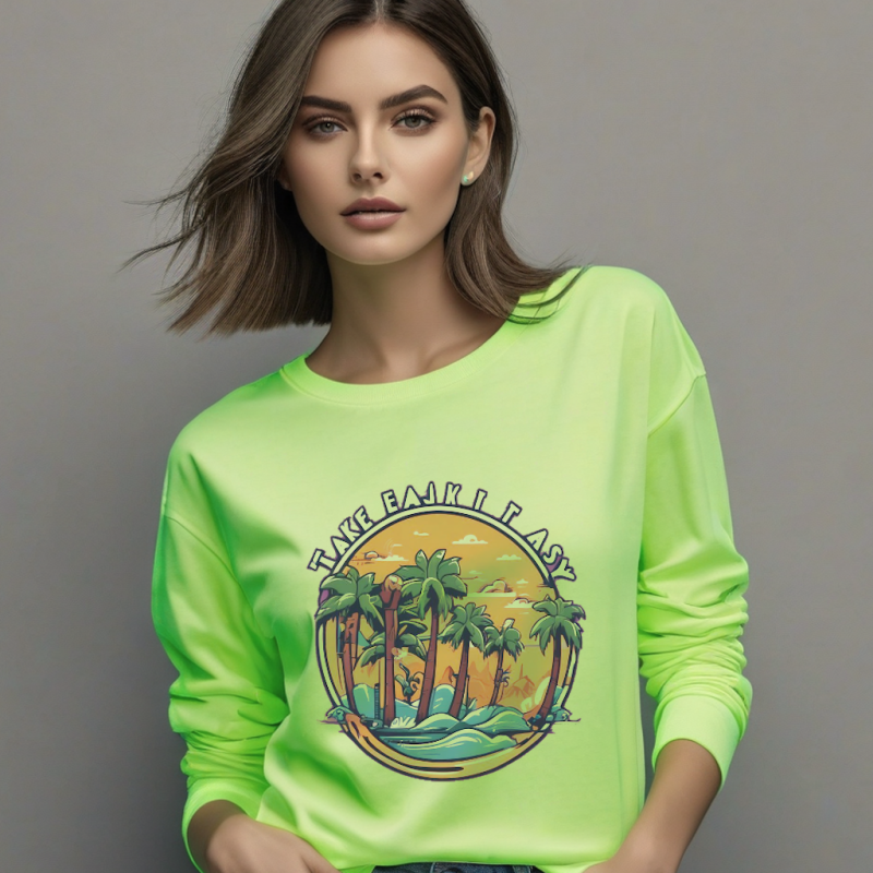 Take It Easy Graphic T-Shirt – Neon Green Cotton Long Sleeve for Her