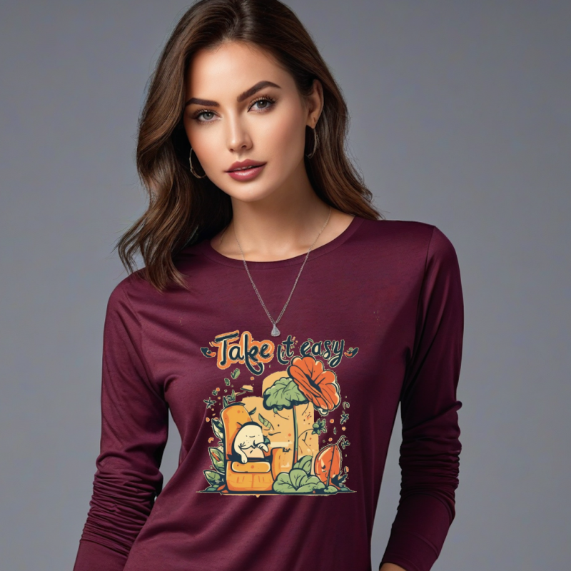 Take It Easy Women’s Tee – Soft Cotton, Wine, Long Sleeves