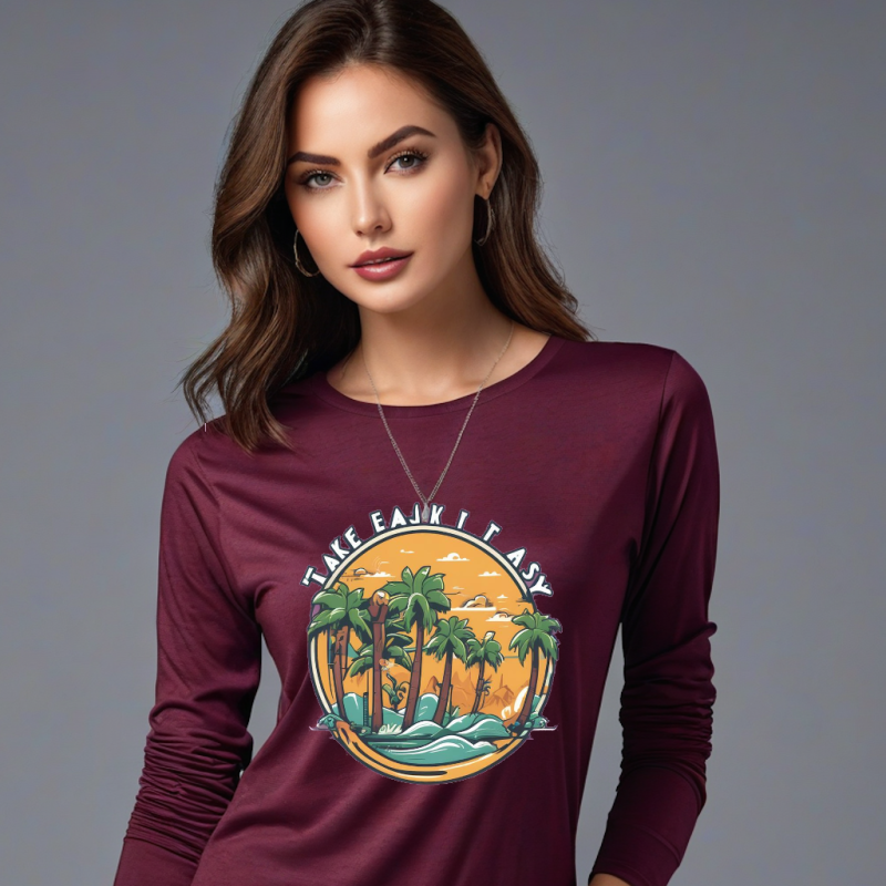 Take It Easy Women’s Tee – Soft Cotton, Wine, Long Sleeves