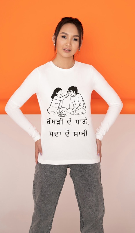 Celebrate the unique and cherished bond between brothers and sisters with our White Cotton Full-Sleeve T-Shirt for women. This t-shirt features a heartwarming depiction of the brother-sister relationship, accompanied by a Punjabi tagline, making it a perfect gift that speaks to the deep connection shared by siblings. Material: Made from premium 100% cotton, 250 GSM, this t-shirt offers a soft, durable, and slightly thicker fabric for superior comfort. Design: Showcases a beautiful illustration of the brother-sister bond, enhanced by a meaningful Punjabi tagline that resonates with the love and warmth of sibling relationships. Sleeves: Full sleeves for added warmth and a stylish look, perfect for both casual and special occasions. Fit: Regular fit with a round neck, designed to provide comfort while maintaining a flattering silhouette. Color: Timeless white, easy to pair with any outfit, making it a versatile addition to any wardrobe. Occasion: Ideal for gifting to your sister or as a special gesture to celebrate your bond with her, whether on a festival or just to show you care. Product Details: Material: Premium Cotton, 250 GSM Sleeves: Full sleeves Fit: Regular fit Color: White Design: Brother-sister bond illustration with Punjabi tagline Neckline: Round neck Care Instructions: Machine wash cold, tumble dry low, do not bleach Express your love and affection for your sister with this thoughtfully designed t-shirt, a perfect way to celebrate the special bond you share. |