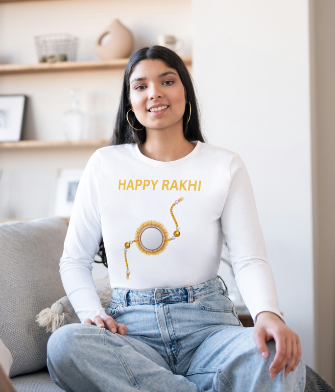 # White Cotton Full-Sleeve T-Shirt with HAPPY RAKHI Tagline for Women Step into style and comfort with our White Cotton Full-Sleeve T-Shirt, designed exclusively for women who cherish elegance and tradition. This classic tee not only offers a chic look but also brings a touch of festive joy with its unique "HAPPY RAKHI" tagline. Crafted from 100% pure cotton, this full-sleeve T-shirt promises ultimate comfort and breathability, making it perfect for all-day wear. The soft, lightweight fabric drapes beautifully, offering a flattering fit for all body types. Its pristine white hue acts as a canvas, highlighting the vibrant "HAPPY RAKHI" tagline in an eye-catching design. Whether you're celebrating with your siblings or heading out for a casual day, this T-shirt is your go-to choice. Raksha Bandhan is a festival of love, protection, and cherished memories. With our T-shirt, you can wear your sentiments proudly. The "HAPPY RAKHI" slogan is not just a message but a celebration of the unbreakable bond between brothers and sisters. Pair it with your favorite jeans or a flowing skirt to create a festive look that speaks volumes. > "A sister is both your mirror – and your opposite." – Elizabeth Fishel Whether you're lounging at home, attending a casual get-together, or joining a festive Rakhi celebration, this T-shirt is versatile enough to suit any occasion. The full sleeves add an extra touch of elegance, making it suitable for both day and evening wear. We are committed to sustainability. Our T-shirt is not only stylish but also eco-friendly, ensuring that you contribute to a better planet while looking fabulous. Ethically produced, each purchase supports fair trade practices, creating a positive impact on the lives of our artisans. Looking for a thoughtful gift for your sister This T-shirt makes for a perfect Rakhi present, symbolizing love, care, and the promise of protection. Packaged beautifully, it’s ready to be gifted and cherished for years to come. Indulge in the perfect blend of tradition and modernity with our White Cotton Full-Sleeve T-Shirt with HAPPY RAKHI Tagline. Make every moment count, create memories, and celebrate the special bond with style. |